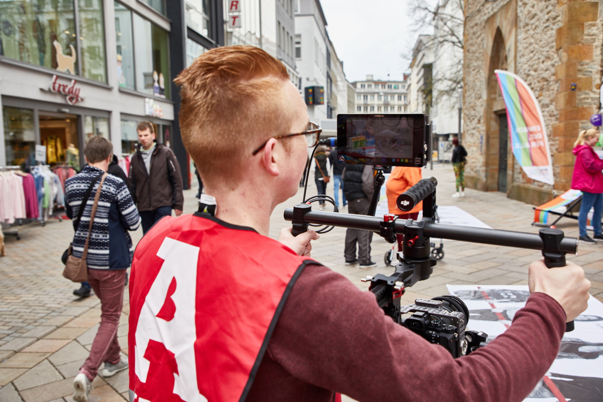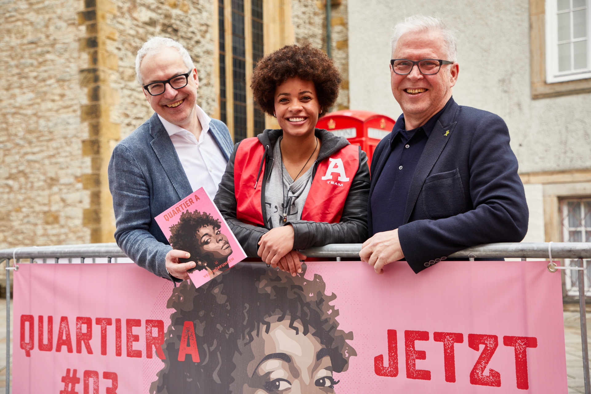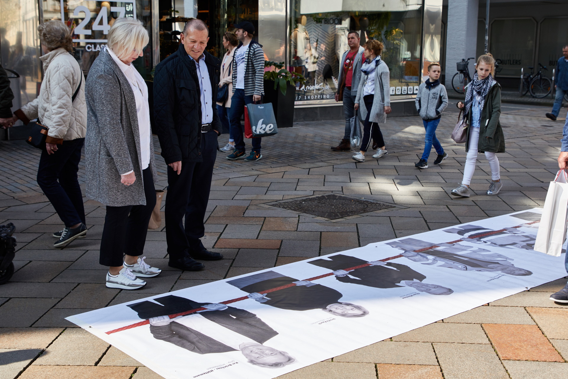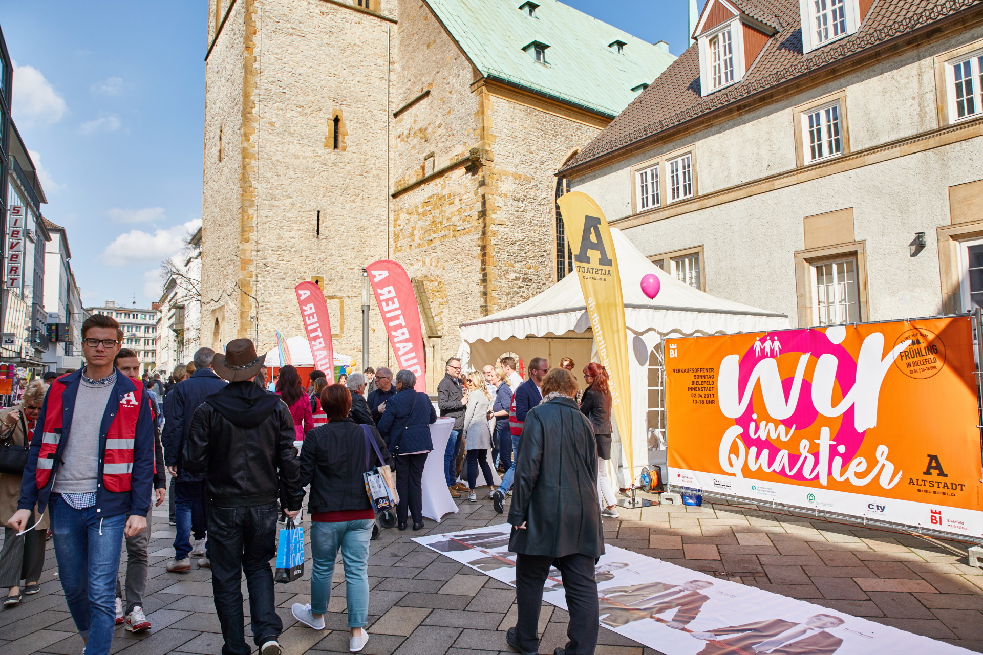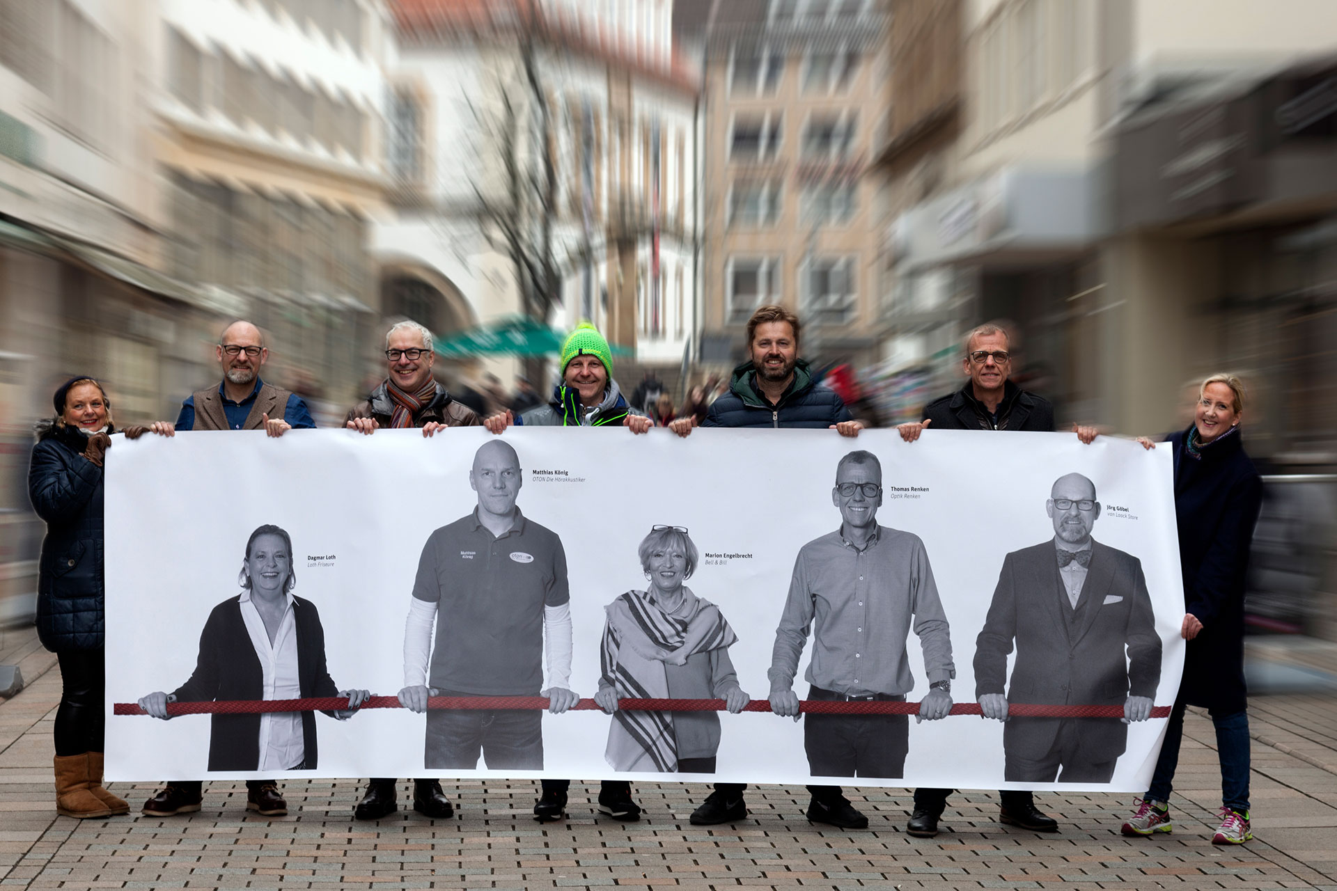 Nach intensiver Vorbereitung, 4 Tagen Foto-Shooting, Bildbearbeitung und Produktion wurden zum verkaufsoffenen Sonntag, den 02.04., über 700 Portraits von Menschen ausgestellt, die in der Altstadt arbeiten. Ausgedruckt auf Bannermaterial, wurden sie auf einer Strecke von ca. einem Kilometer in der Bielefelder Altstadt präsentiert. Unabhängig ob Apotheker, Gastronom, Kaufmann, Zahntechnikerin oder Mitarbeiter des Umweltbetriebes; alle zeigen: Wir sind die Altstadt. Verbunden durch ein starkes Band, zeigt die Ausstellung die längste Menschenkette Bielefelds. Ein großer Publikumserfolg. extrem beweglich: Idee, Konzept, Gestaltung, Organisation und Durchführung Fotos: Irene von Uslar