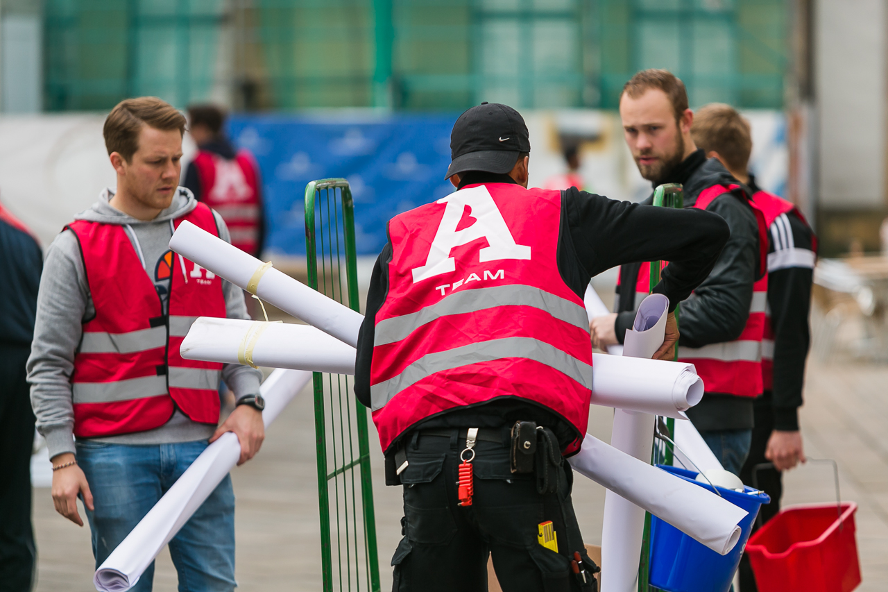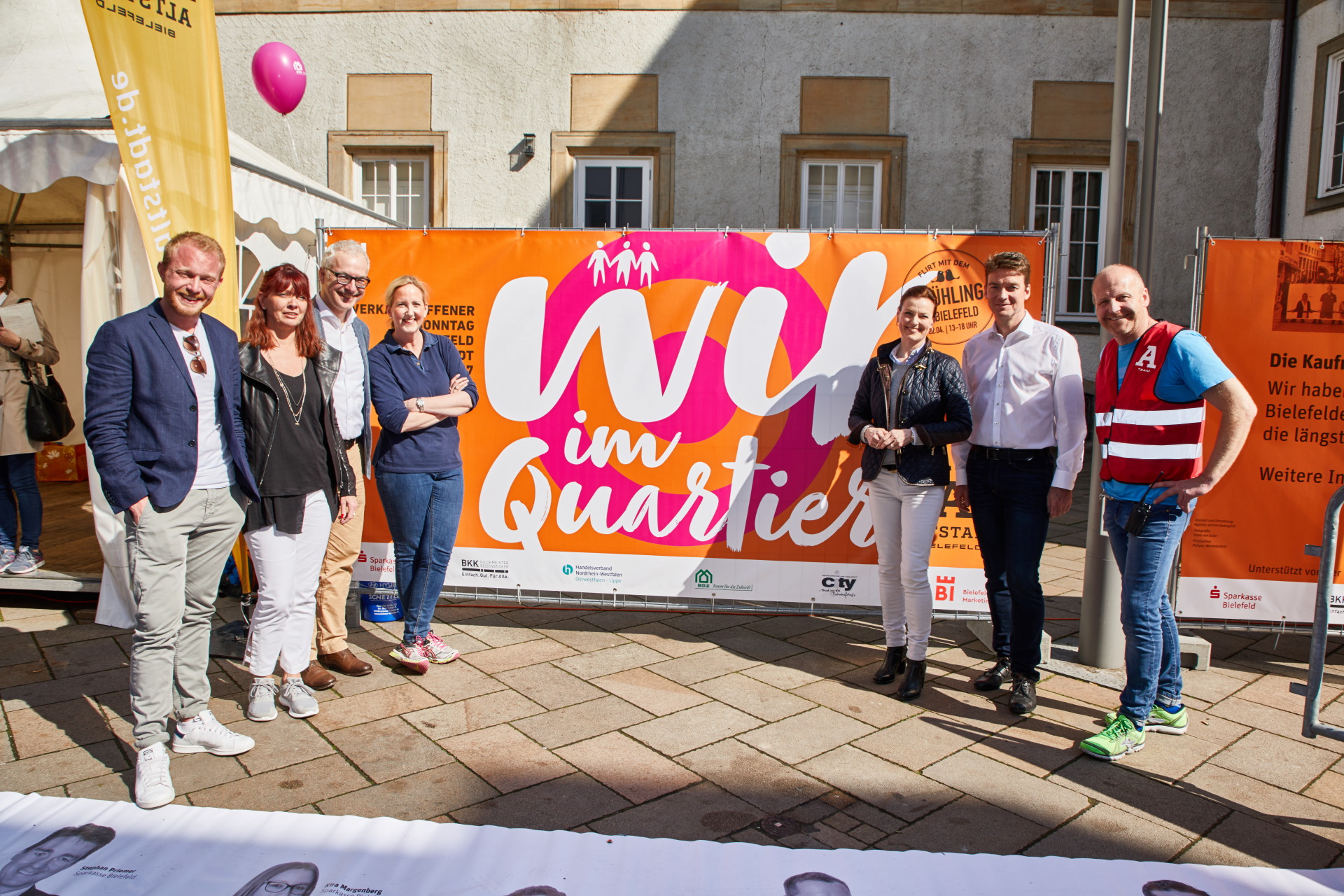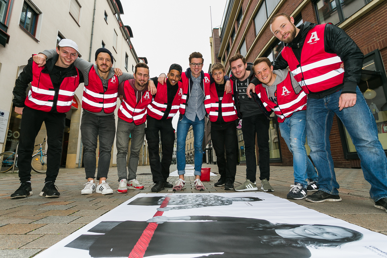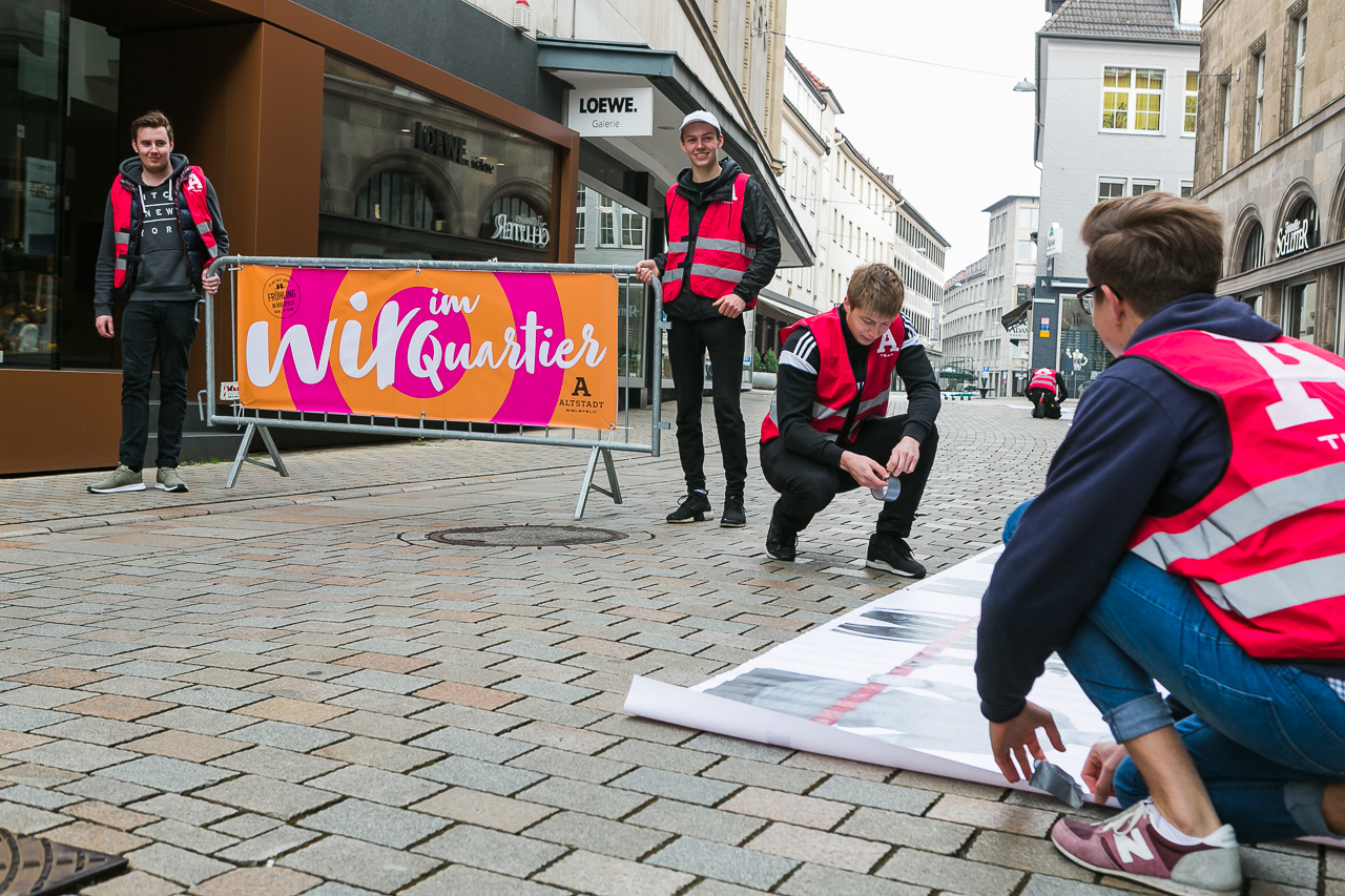 Nach intensiver Vorbereitung, 4 Tagen Foto-Shooting, Bildbearbeitung und Produktion wurden zum verkaufsoffenen Sonntag, den 02.04., über 700 Portraits von Menschen ausgestellt, die in der Altstadt arbeiten. Ausgedruckt auf Bannermaterial, wurden sie auf einer Strecke von ca. einem Kilometer in der Bielefelder Altstadt präsentiert. Unabhängig ob Apotheker, Gastronom, Kaufmann, Zahntechnikerin oder Mitarbeiter des Umweltbetriebes; alle zeigen: Wir sind die Altstadt. Verbunden durch ein starkes Band, zeigt die Ausstellung die längste Menschenkette Bielefelds. Ein großer Publikumserfolg. extrem beweglich: Idee, Konzept, Gestaltung, Organisation und Durchführung Fotos: Irene von Uslar